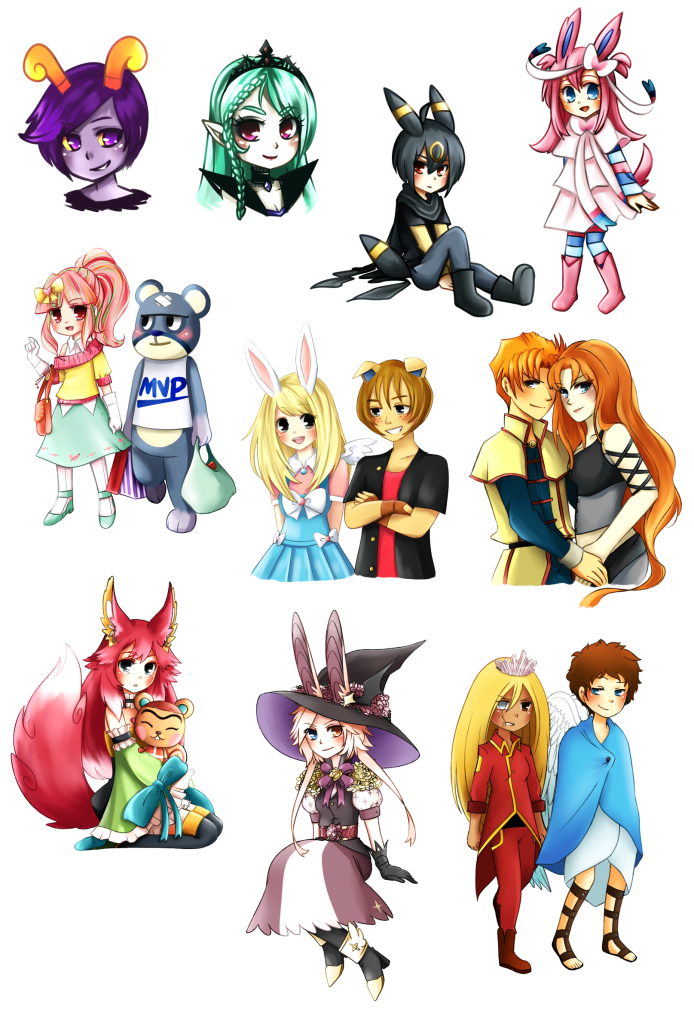 I didn't display any examples since I thought most TBT members have already seen them through my auctions and shops, lol. I'll be offering experimental art, so I don't have a specific style in mind yet... But here are some (pretty old) drawings to give you an idea of what a waist-up and chibi/fullbody looks like: